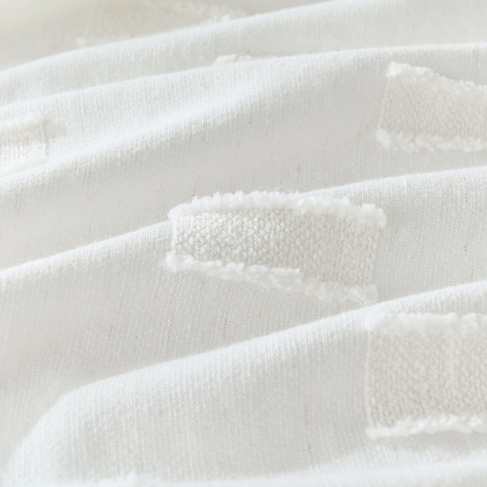 Solace is designed to bring a sense of quiet order to the room. Its soft white base is woven with subtle raised details, adding gentle texture without visual weight. Light passes through evenly, creating a calm, balanced glow throughout the space. The fabric drapes naturally, holding its shape while remaining relaxed and comfortable. Solace feels thoughtful and understated—an easy choice for spaces that value softness, structure, and everyday ease.