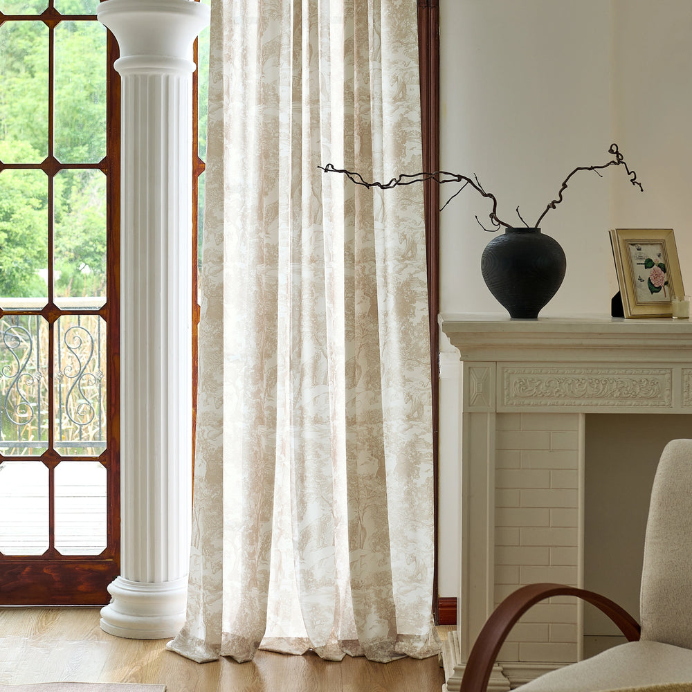 The illustrated scenes feel softly drawn by daylight, appearing and fading as the hours pass. As a sheer, it remains gently present—never dominating the space, but quietly shaping its mood. Chosen by those who appreciate subtle detail and thoughtful design, Faelorn turns the window into a refined expression of taste, carried lightly by air and light.